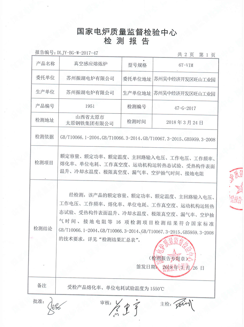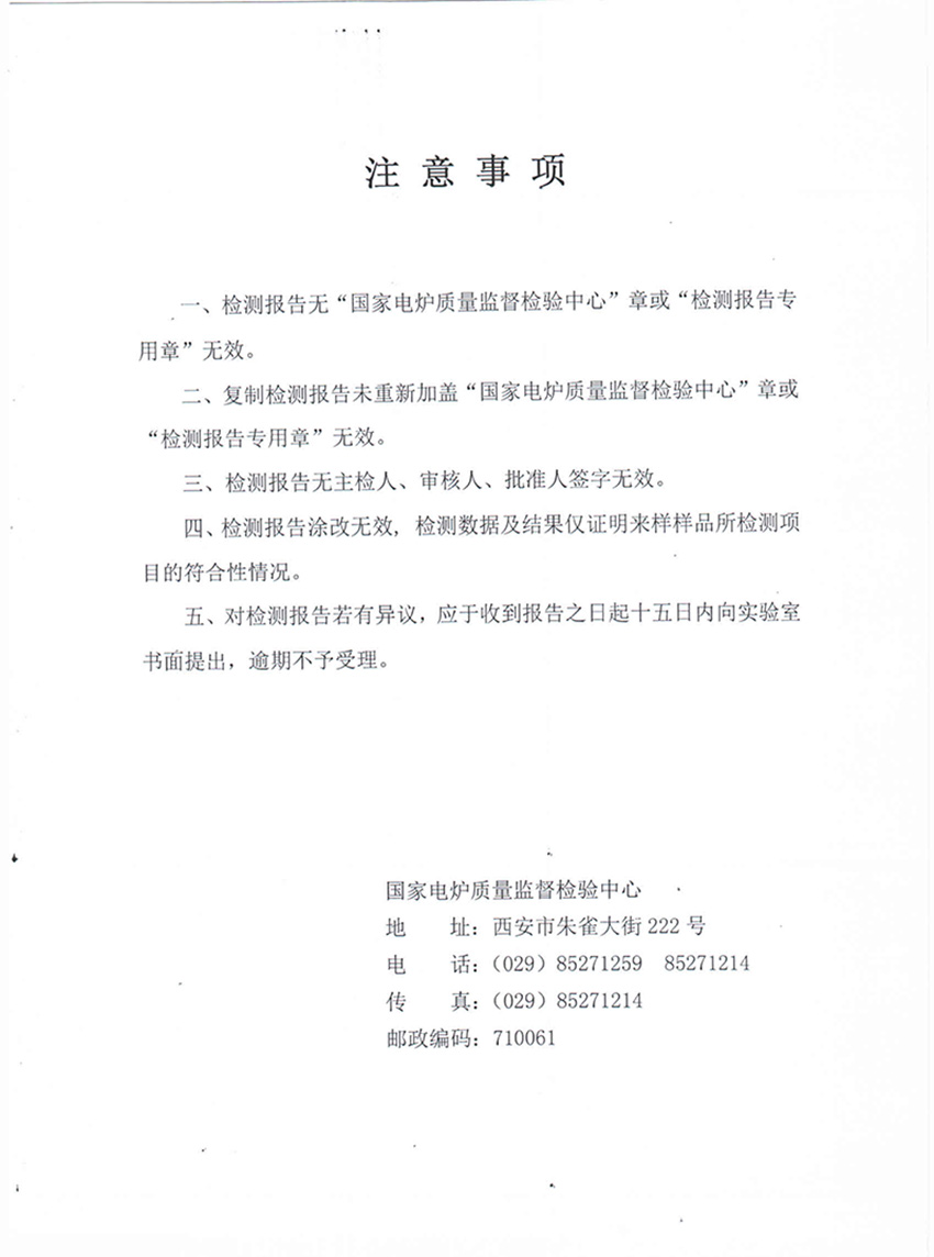 國(guó)家電爐質(zhì)量監(jiān)督檢驗(yàn)中心頒發(fā)的合格證及檢測(cè)報(bào)告